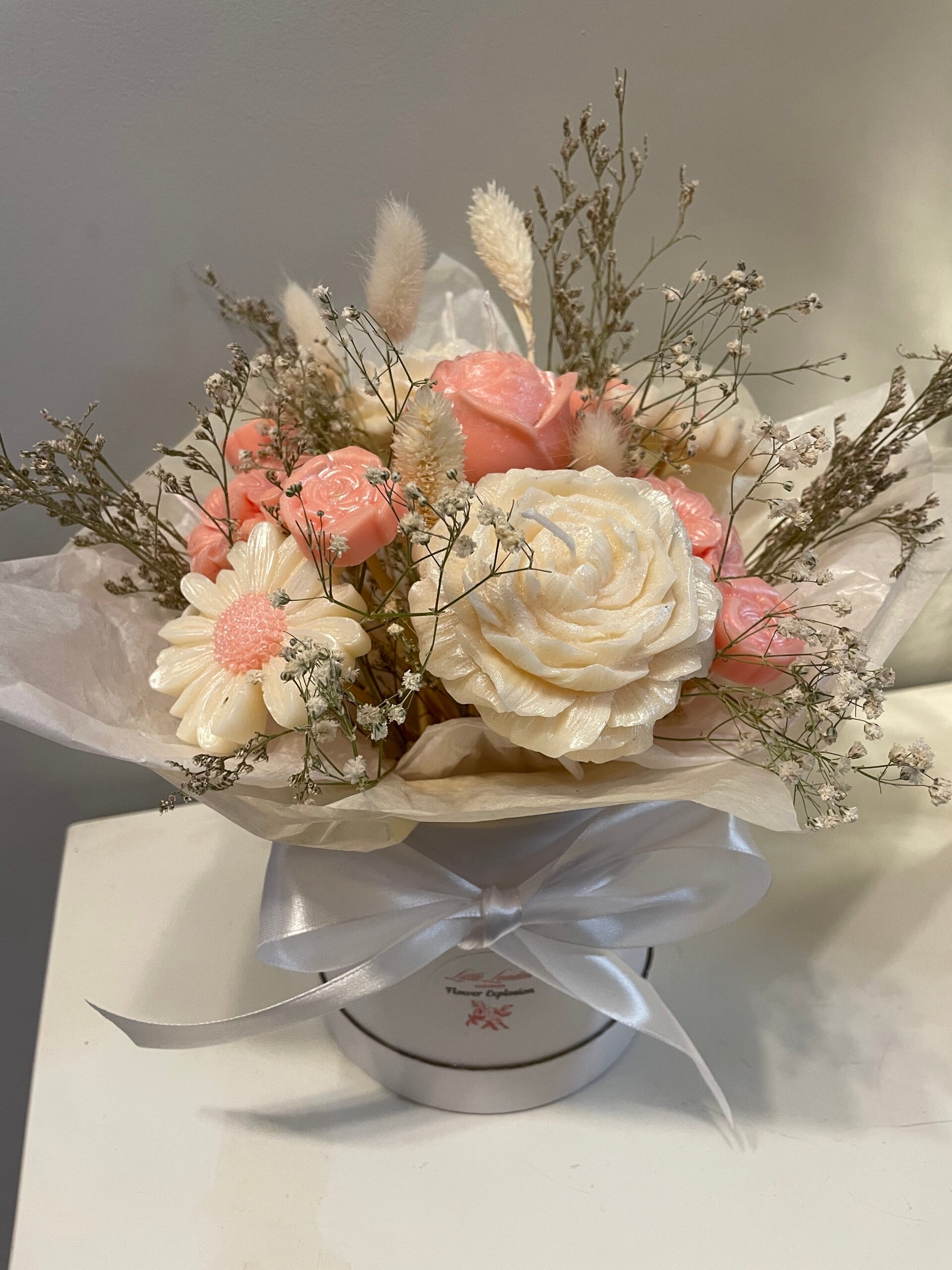 3 Flower Pillar candles, 4 Large flower wax melts, 4 regular sized flower wax melts in a white flower box with dried flowers .